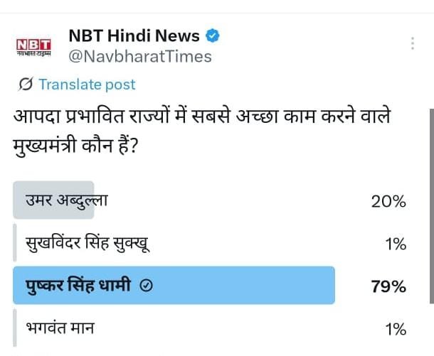 देहरादून: देश के आपदा प्रभावित राज्यों के मुख्यमंत्रियों के कामकाज पर आयोजित टाइम्स ग्रुप के सर्वे में उत्तराखंड के मुख्यमंत्री पुष्कर सिंह धामी ने शीर्ष स्थान हासिल किया है। देश के आपदा प्रभावित राज्यों के मुख्यमंत्रियों के प्रदर्शन को लेकर नवभारत टाइम्स ने हाल ही में एक ऑनलाइन सर्वे कराया। सवाल था “आपदा प्रभावित राज्यों में सबसे बेहतर काम करने वाले मुख्यमंत्री कौन हैं?” इस सर्वे में चार नाम शामिल थे उमर अब्दुल्ला, सुखविंदर सिंह सुक्खू, पुष्कर सिंह धामी और भगवंत मान।